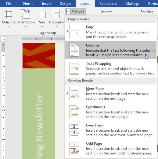 Bước 2: Chọn thẻ Layout và click chọn Breaks. Một danh sách sẽ hiện ra sau đó.