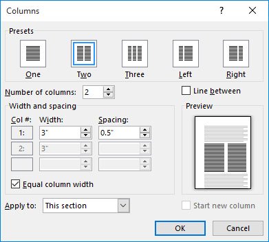 Các lựa chọn liên quan tới cột không hạn chế trong danh sách bạn thấy. Để mở hộp thoại Columns với đầy đủ các lựa chọn, click More Columns. Sau đó chọn số lượng cột trong mục Number of columns.