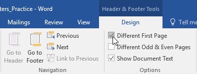 Ẩn tiêu đề hoặc chân trang của trang đầu tiên: Đối với một số văn bản, có thể bạn không muốn để tiêu đề và chân trang ở ngay trang đầu tiên, ví dụ như khi muốn đánh số thứ tự từ trang thứ 2 hoặc muốn dùng nó làm trang bìa. Để ẩn tiêu đề hoặc chân trang ở trang đầu, hãy click chọn hộp Different First Page.