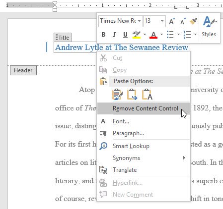 Nếu muốn xóa Content Control, click chuột phải và chọn Remove Content Control trong danh sách hiện ra sau đó.