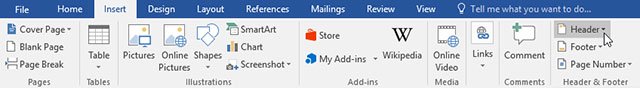 Bước 1: Chọn thẻ Insert và click Header (hoặc Footer). Trong ví dụ này, ta sẽ click Header.