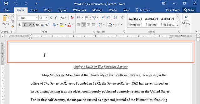 Word 2016 sở hữu nhiều tiêu đề trang và chân trang có sẵn mà bạn có thể dùng để văn bản trông đẹp mắt hơn. Dưới đây, ta sẽ thêm tiêu đề trang có sẵn vào văn bản.