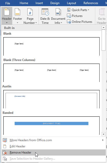 Xóa tiêu đề hoặc chân trang: Khi muốn xóa mọi thông tin chứa trong tiêu đề trang, click Header và chọn Remove Header trong danh sách hiện ra. Làm tương tự với chân trang bằng cách chọn Footer.