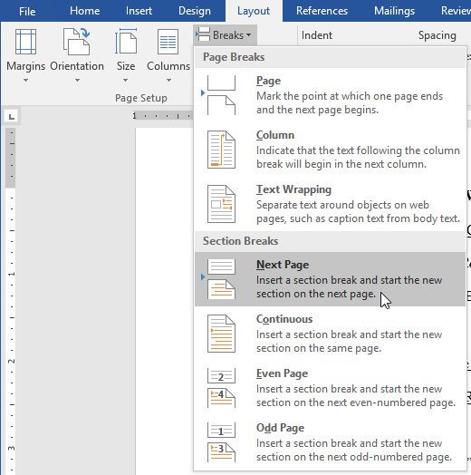 Bước 2: Chọn thẻ Layout, Next Page trong mục Section Breaks từ trình thả hiện ra sau đó.