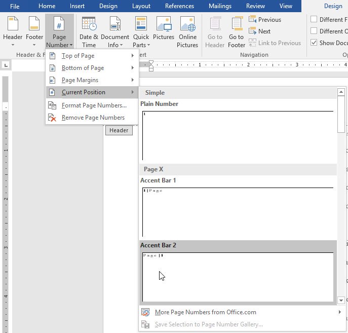 Bước 2: Trên thẻ Design, click Page Number. Trong danh sách hiện ra sau đó, rê chuột qua Current Position và chọn kiểu hiển thị số trang bạn thích.