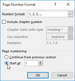 Bước 6: Trong hộp thoại xuất hiện ra sau đó, chọn Start at. Đây là số đầu tiên mà bạn sẽ đánh thứ tự cho trang, mặc định được chọn là 1. Nếu muốn bạn có thể thay đổi, ví dụ như đánh thứ tự từ số 5. Sau đó click OK.