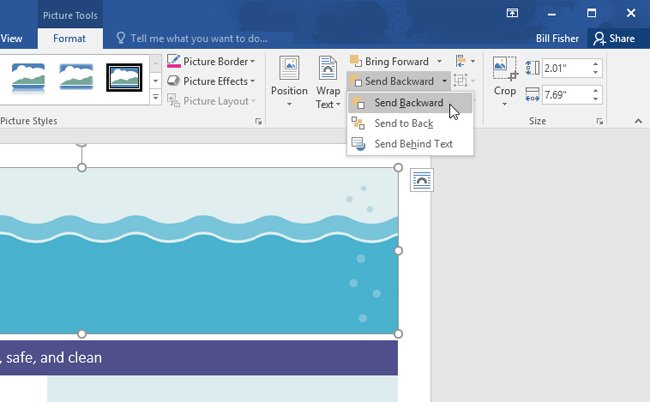 Bước 5: Trong ví dụ này, hình ảnh sóng được di chuyển ra phía sau các đối tượng khác, bằng cách nhấp chọn lệnh Send to Back trong mục Send Backward. Do đó, tất cả các văn bản và hình dạng đều hiển thị phía trước hình ảnh sóng.