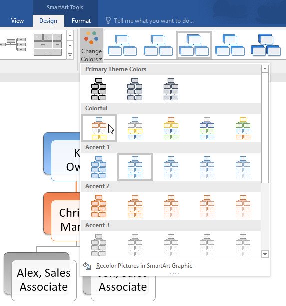 - Có nhiều kiểu màu để bạn sử dụng với SmartArt. Để thay đổi màu sắc, nhấp vào lệnh Change Colors (thay đổi màu sắc) và chọn tùy chọn mong muốn từ trình đơn thả xuống.