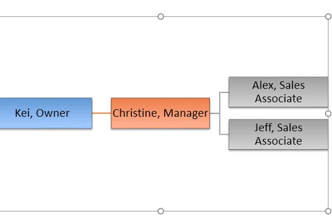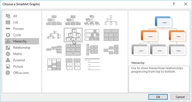 - Trong ví dụ, chúng tôi đã tổ chức một đồ hoạ với bố cục hierarchical (có thứ bậc). Không phải tất cả đồ họa SmartArt đều sử dụng loại bố cục này, vì vậy hãy nhớ rằng các lệnh này có thể hoạt động khác nhau (hoặc không hoàn toàn tùy thuộc) vào bố cục của đồ hoạ.