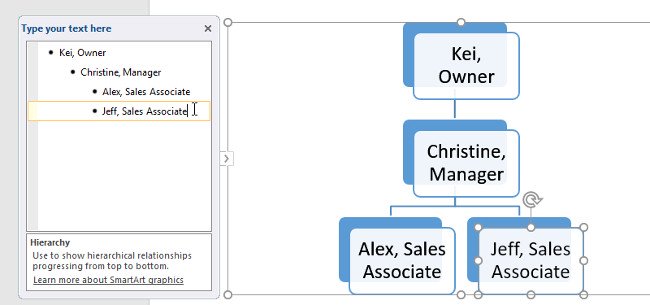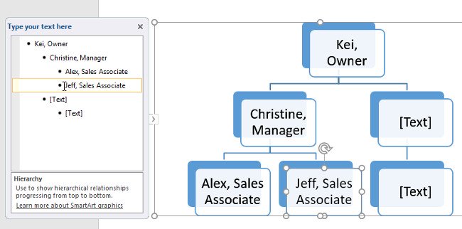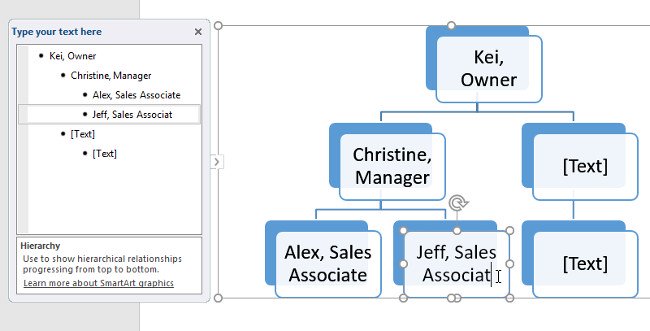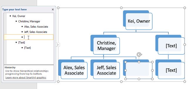 Thật dễ dàng để thêm hình dạng mới, thay đổi thứ tự và thậm chí xoá hình dạng từ đồ họa SmartArt của bạn. Bạn có thể làm tất cả điều này trong khung văn bản và nó giống như việc tạo một bản phác thảo với một multilevel list. Để biết thêm thông tin về multilevel list, bạn có thể xem lại bài viết List của chúng tôi.