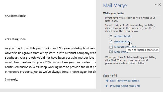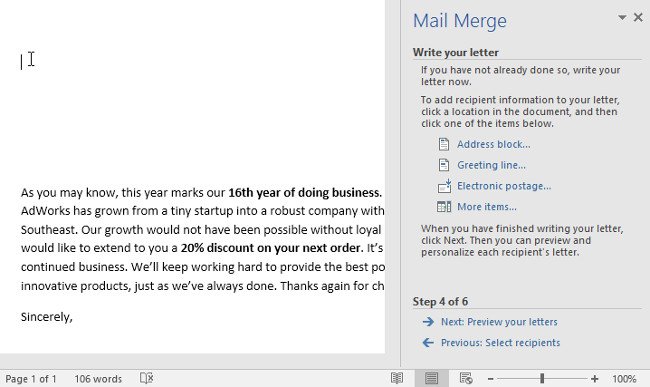 Bây giờ bạn đã sẵn sàng để viết thư rồi đó. Khi nó được in, mỗi bản sao của bức thư về cơ bản sẽ giống nhau; chỉ có dữ liệu người nhận (như tên và địa chỉ) sẽ khác. Bạn sẽ cần thêm các placeholder phần giữ chỗ cho dữ liệu người nhận để Mail Merge biết chính xác nơi để thêm dữ liệu.