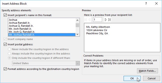 4. Trong hộp thoại Mail Merge Recipients, bạn có thể chọn hoặc bỏ chọn từng ô để kiểm soát những người nhận được bao gồm trong hợp nhất. Theo mặc định, tất cả người nhận phải được chọn. Khi hoàn tất, hãy nhấp vào OK.