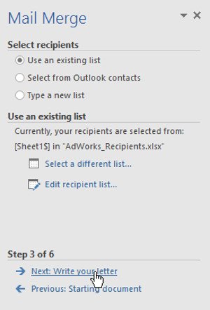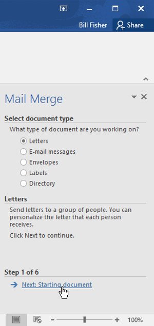 - Hộp Mail Merge sẽ xuất hiện và hướng dẫn bạn qua sáu bước chính để hoàn tất việc hợp nhất. Ví dụ sau sẽ minh họa cách làm thế nào để tạo ra một mẫu thư và hợp nhất bức thư với một danh sách người nhận.