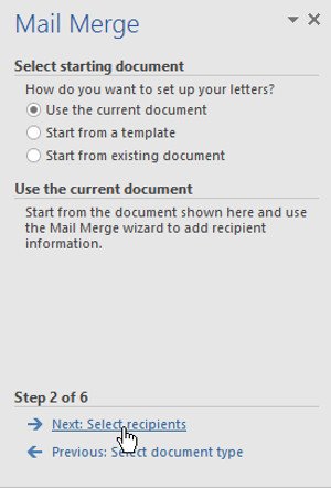 - Chọn Use the current document (Sử dụng tài liệu hiện có), sau đó nhấp Next: Select recipients (Tiếp theo: Chọn người nhận) để chuyển sang Bước 3.