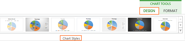 Khi biểu đồ hình tròn vừa chèn vào trang tính, bạn có thể đi đến nhóm Design, thử nhiều kiểu biểu đồ khác nhau trong nhóm Charts và chọn kiểu phù hợp nhất với dữ liệu của bạn.