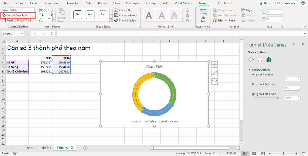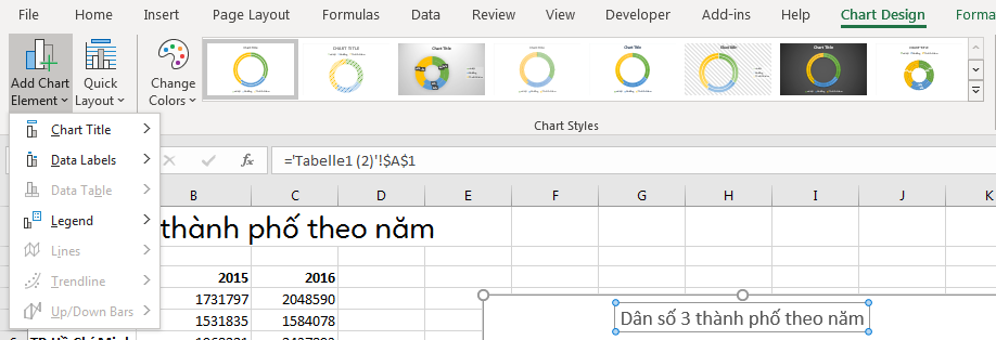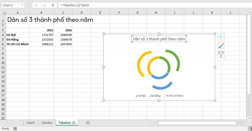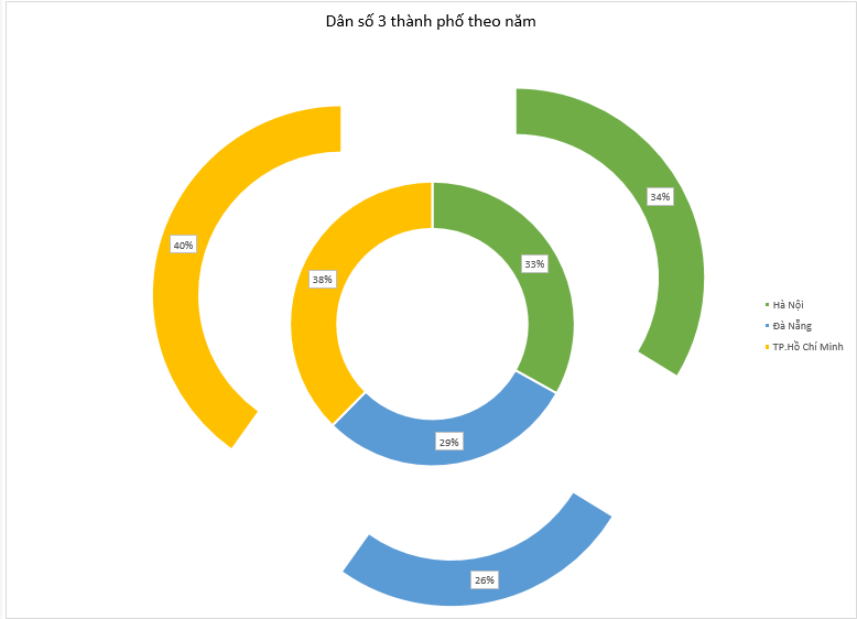 Để tạo một biểu đồ doughnut, trước tiên ta cần có dữ liệu. Dữ liệu mẫu ta sẽ sử dụng trong trường hợp này là dân số 3 thành phố ở Việt Nam trong 2 năm 2015 và 2016 như ảnh dưới: