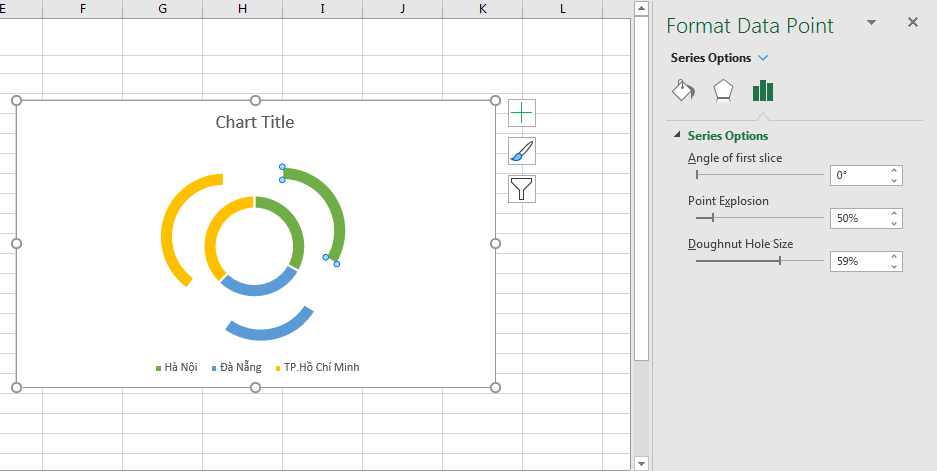Ngoài ra, bạn có thể chọn phần biểu đồ mà bạn muốn di chuyển ra, nhấp chuột phải vào nó, chọn Format Data Series. Sau đó, đi đến Series Options từ bảng Format Data Series, thiết lập Point Explosion: