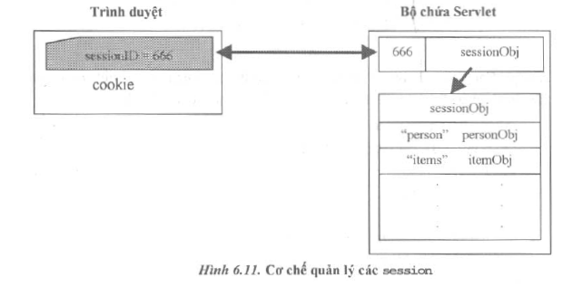 Một vấn đề quan trọng nữa cần quan tâm là việc quản lý các phiên làm việc trong JSP. Theo mặc định, tất cả các trang JSP đều tham gia vào một phiên session của HTTP. Các phiên session là những nơi thích hợp để tổ chức lưu trữ các Bean và những đối tượng càn thiết sử dụng chung cho các trang JSP với các Servlet mà người sừ dựng cần truy cập. Mỗi session được xác định thông qua định danh ID và được lưu ờ trình duyệt cùng với mẩu tin cookie.