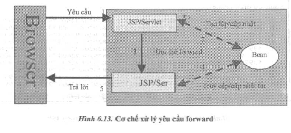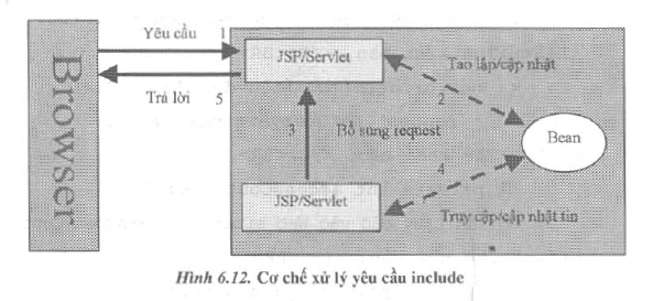 Nó được dùng để định hướng yêu cầu tới những nguồn tài nguyên tĩnh hoặc động trong cùng ngữ cảnh theo địa chì relative URL như khi gội trang JSP. Cơ chế thực hiện bằng cách tạo ra các tham số là các JavaBean tài nguyên (được giới thiệu ờ chương V) và đưa chúng vào yêu cầu, được mô tả như hình 6.12.