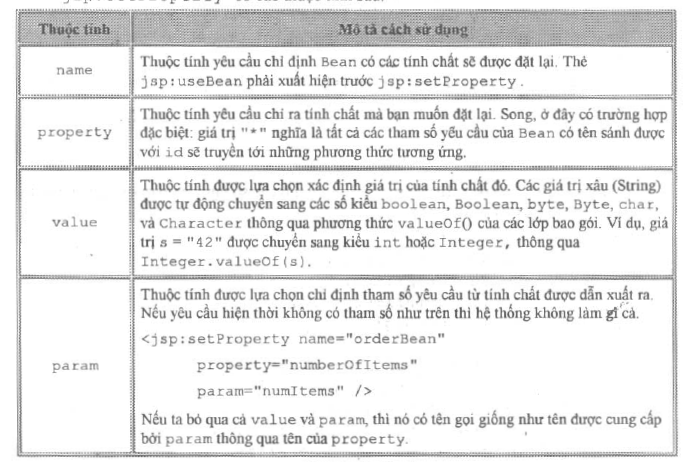 Bạn có thể sử dụng thẻ jsp: setProperty để đặt lại các tính chất của các Bean mà trang JSP tham chiểu tới. Có thể thực hiện theo hai cách.