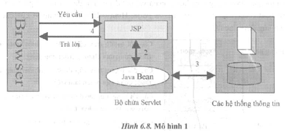 - Mô hình 1. các yêu cầu đầu vào từ Web Browser được gửi trực tiếp tới trang JSP, ở đó chúng được xừ lý và trả lời cho Client. Trong mô hình này, mọi vẩn đề truy cập đều được đảm nhận bời các Java Bean.
