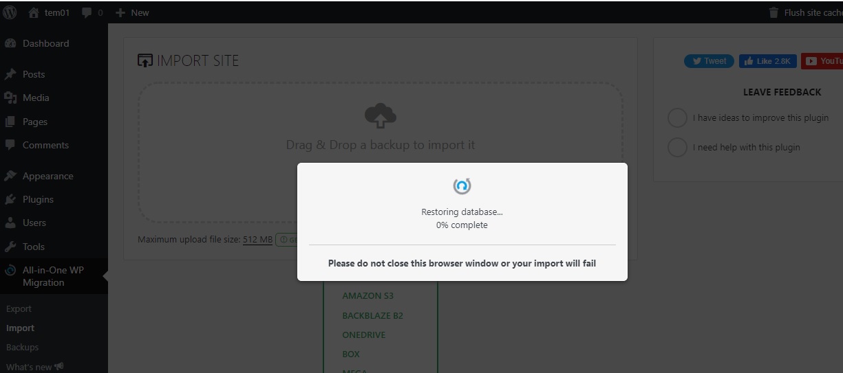 Khi di chuyển website bằn plugin All-in-One WP Migration, lỗi thường xảy ra là quá trình nhập file, thường cũ nhiều năm trước, vào website mới chạy mãi cả tiếng không dừng, giao diện bị đơ hay dừng lại ở giai đoạn cuối như hình dưới (hoặc hình tương tự). Đó là do các plugins đã không còn tương thích, hay bị lỗi khi nhập, hoặc không còn được hỗ trợ nữa.
