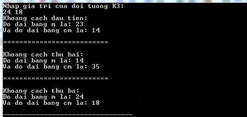 #include <iostream> using namespace std; class KhoangCach { private: int met; int centimet; public: // phan khai bao cac constructor can thiet KhoangCach(){ met = 0; centimet = 0; } KhoangCach(int m, int c){ met = m; centimet = c; } friend ostream &operator<<( ostream &output, const KhoangCach &K ) { output << "\nDo dai bang m la: " << K.met << "\nVa do dai bang cm la: " << K.centimet; return output; } friend istream &operator>>( istream &input, KhoangCach &K ) { input >> K.met >> K.centimet; return input; } }; int main() { KhoangCach K1(23, 14), K2(14, 35), K3; cout << "Nhap gia tri cua doi tuong K3: " << endl; cin >> K3; cout << "Khoang cach dau tien: " << K1 << endl; cout << "\n==========================\n" << endl; cout << "Khoang cach thu hai: " << K2 << endl; cout << "\n==========================\n" << endl; cout << "Khoang cach thu ba: " << K3 << endl; return 0; }