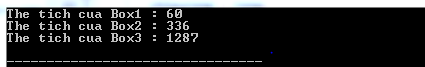 #include <iostream> using namespace std; class Box { double chieudai; // Chieu dai cua mot box double chieurong; // Chieu rong cua mot box double chieucao; // Chieu cao cua mot box public: double tinhTheTich(void) { return chieudai * chieurong * chieucao; } void setChieuDai( double dai ) { chieudai = dai; } void setChieuRong( double rong ) { chieurong = rong; } void setChieuCao( double cao ) { chieucao = cao; } // Nap chong toan tu + de cong hai doi tuong Box. Box operator+(const Box& b) { Box box; box.chieudai = this->chieudai + b.chieudai; box.chieurong = this->chieurong + b.chieurong; box.chieucao = this->chieucao + b.chieucao; return box; } }; // ham main cua chuong trinh int main( ) { Box Box1; // Khai bao Box1 la cua kieu Box Box Box2; // Khai bao Box2 la cua kieu Box Box Box3; // Khai bao Box3 la cua kieu Box double thetich = 0.0; // Luu giu the tich cua mot box tai day // thong tin chi tiet cua box 1 Box1.setChieuDai(3.0); Box1.setChieuRong(4.0); Box1.setChieuCao(5.0); // thong tin chi tiet cua box 2 Box2.setChieuDai(6.0); Box2.setChieuRong(7.0); Box2.setChieuCao(8.0); // the tich cua box 1 thetich = Box1.tinhTheTich(); cout << "The tich cua Box1 : " << thetich <<endl; // the tich cua box 2 thetich = Box2.tinhTheTich(); cout << "The tich cua Box2 : " << thetich <<endl; // Cong hai doi tuong: Box3 = Box1 + Box2; // the tich cua box 3 thetich = Box3.tinhTheTich(); cout << "The tich cua Box3 : " << thetich <<endl; return 0; }