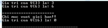 #include <iostream> using namespace std; const int KICHCO = 15; class ViDuMang { private: int mang[KICHCO]; public: ViDuMang() { register int i; for(i = 0; i < KICHCO; i++) { mang[i] = i; } } int &operator[](int i) { if( i > KICHCO ) { cout << "\n======================\n" <<endl; cout << "Chi muc vuot gioi han!!" <<endl; // Tra ve phan tu dau tien. return mang[0]; } return mang[i]; } }; int main() { ViDuMang V; cout << "Gia tri cua V[3] la: " << V[3] <<endl; cout << "Gia tri cua V[6] la: " << V[6]<<endl; cout << "Gia tri cua V[16] la: " << V[16]<<endl; return 0; }