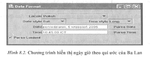 Ví dụ 8.2. Viết chương trình hiển thị ngày giờ cùa máy tính hiện thời theo các khu vực và theo dạng: DEFAULT, LONG, MEDIUM, SHORT được người sử dụng lựa chọn ở các ComboBox: Locale, Date style, Time style. Ví dụ, khi người sừ dụng chọn vùng Ba Lan (Polish) và dạng hiển thị ngày là FULL, dạng thời gian là LONG thì hệ thống sẽ hiển thị