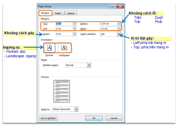 1. Tab Margin – Thiết lập lề và hướng giấy trong hộp thoại Page Setup