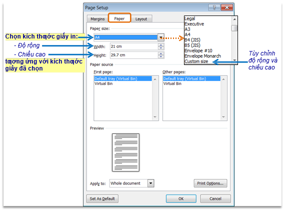 2. Tab Paper – Kích thước giấy in trong hộp thoại Page Setup