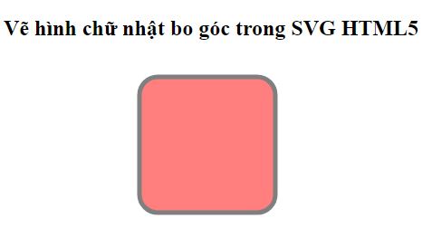 <!DOCTYPE html><html><body><h2>Vẽ hình chữ nhật bo góc trong SVG HTML5</h2><svg width="400" height="180"><rect x="150" y="20" rx="20" ry="20" width="150" height="150"style="fill:red;stroke:black;stroke-width:5;opacity:0.5" /></svg></body></html>