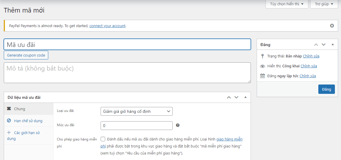- Mô tả: nhập mô tả để biết mã này dùng làm gì. Ví dụ: Là mã ưu đãi giảm giá 10% và áp dụng cho mặt hàng Túi xách.