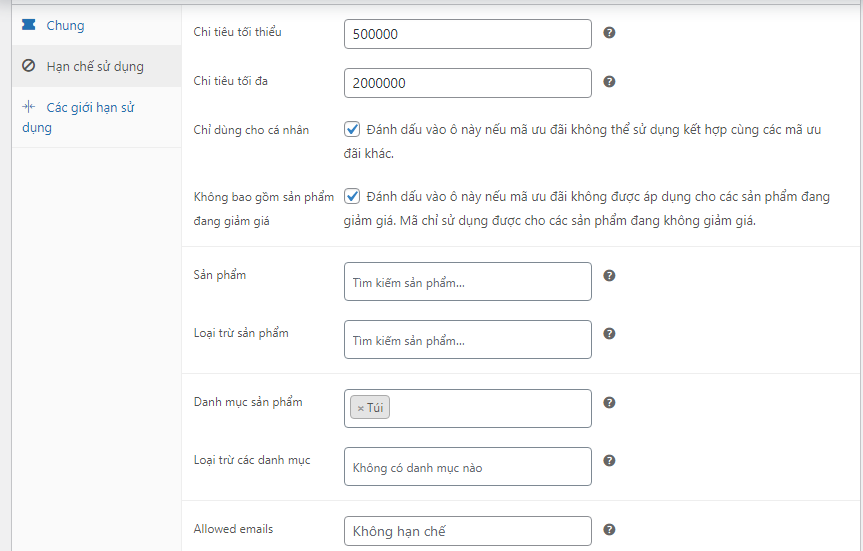 - Allowed email: khách đặt hàng bằng những email này thì mới được ưu đãi. Dùng cho tri ân khách hàng VIP, hoặc sinh nhật khách.