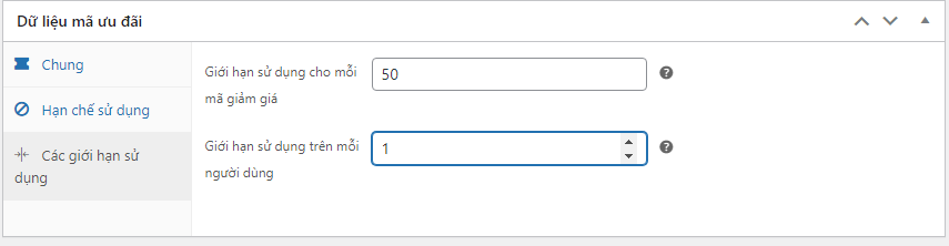 - Giới hạn sử dụng cho mỗi mã giảm giá: mỗi mã giảm giá được sử dụng tối đa bao nhiêu lần, bởi tất cả khách hàng.