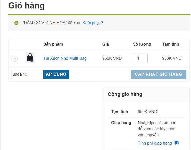 Bây giờ, bạn quay ra trang chủ của trang web. Sau đó, tìm sản phẩm trong danh mục túi, do mình tạo phiếu ưu đãi cho danh mục túi. Bạn chọn một sản phẩm Túi, rồi kích chọn “Thêm vào giỏ hàng”. Sau đó, vào trang Giỏ hàng, Ở đây sẽ có một ô mã ưu đãi, bạn điền mã ưu đãi mình vừa tạo và nhấn nút Áp dụng.