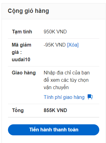 Nếu sản phẩm và giá tiền đủ điều kiện nhận ưu đãi như mình đã thiết lập, giỏ hàng sẽ thông báo thành công. Trong phần tính toán giá tiền, giá ưu đãi cũng được thêm vào và tổng giá tiền sẽ được tính toán lại.