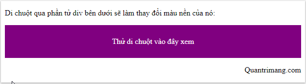 <!DOCTYPE html><html><head><style>div {background-color: purple;color: white;padding: 25px;text-align: center;}div:hover {background-color: #DB7093;}</style></head><body><p>Di chuột qua phần tử div bên dưới sẽ làm thay đổi màu nền của nó:</p><div>Thử di chuột vào đây xem</div></body></html>