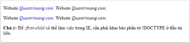 <!DOCTYPE html><html><head><style>p:first-child i {color: blue;}</style></head><body><p>Website <i>Quantrimang.com</i>. Website <i>Quantrimang.com</i>.</p><p>Website <i>Quantrimang.com</i>. Website <i>Quantrimang.com</i>.</p><p><b>Chú ý:</b> Để <i>:first-child</i> có thể làm việc trong IE, cần phải khai báo phần tử !DOCTYPE ở đầu tài liệu.</p></body></html>