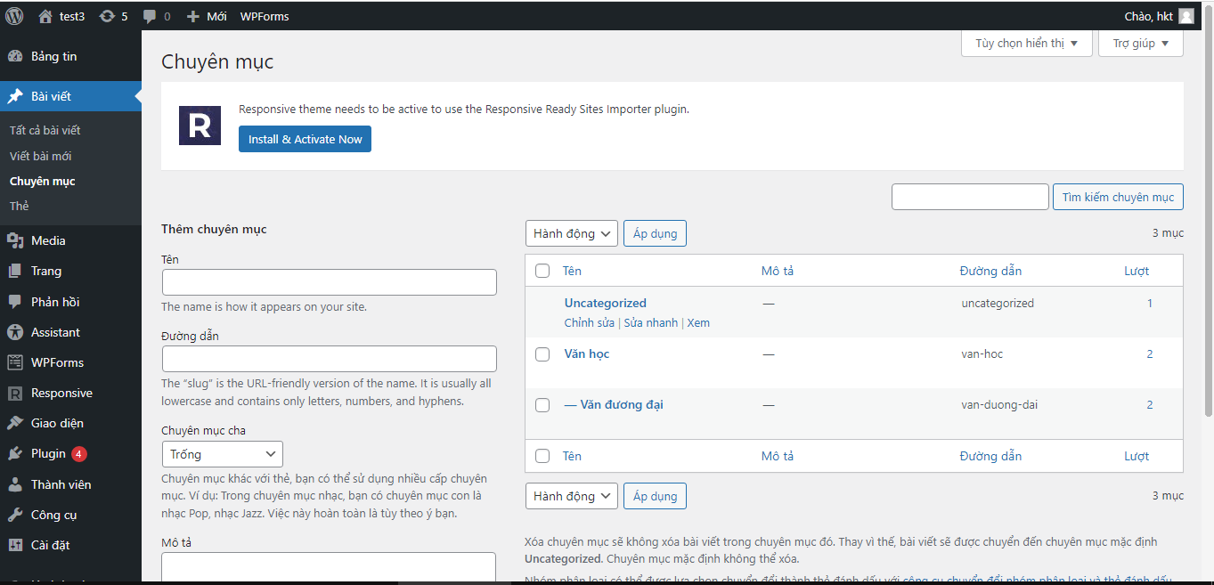Bên trái của màn hình là để thêm các Chuyên mục mới và bên phải là để chỉnh sửa hoặc xóa các Chuyên mục hiện có.