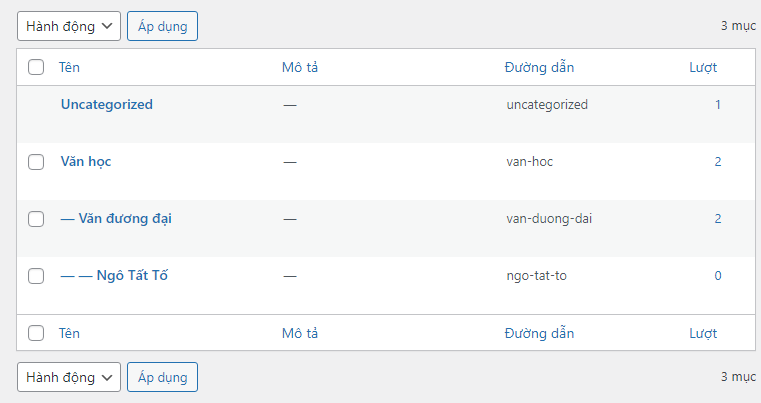 Ở phía bên phải của màn hình, bạn thấy danh sách tất cả các Chuyên mục của mình. Theo mặc định, danh sách sắp xếp theo thứ tự bảng chữ cái. Bốn cột được hiển thị là Tên, Mô tả, Đường dẫn và Lượt (số lượng Bài đăng trong Chuyên mục).