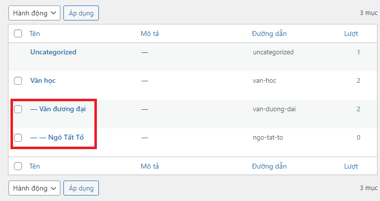 Nếu bạn có các Chuyên mục con, chúng sẽ hiển thị với một dấu gạch ngang bên cạnh và theo thứ tự bảng chữ cái bên dưới danh mục cha của chúng. Nếu bạn có các Chuyên mục con phụ, mỗi cấp được biểu thị bằng một dấu gạch ngang bổ sung.