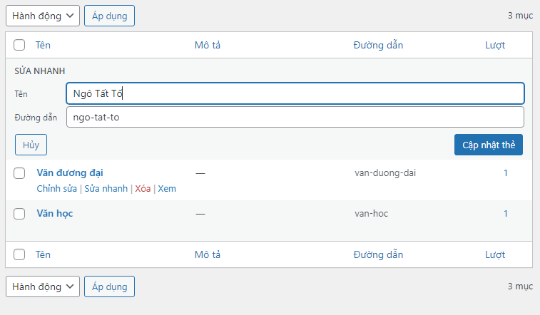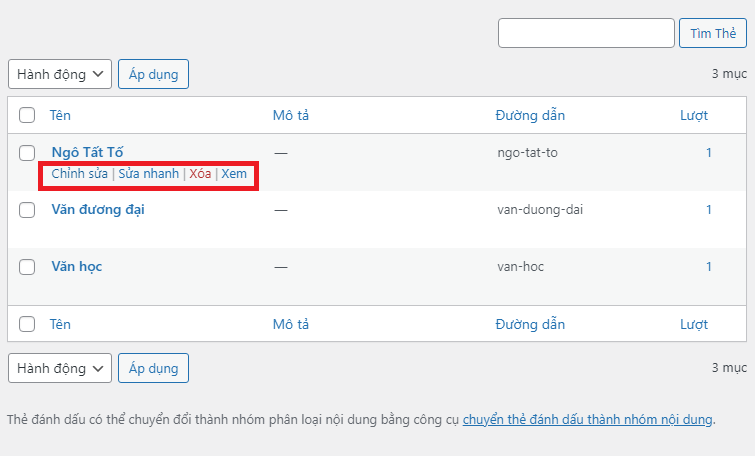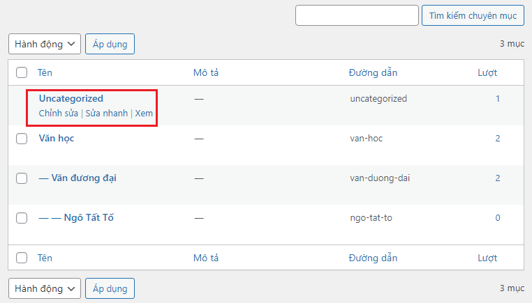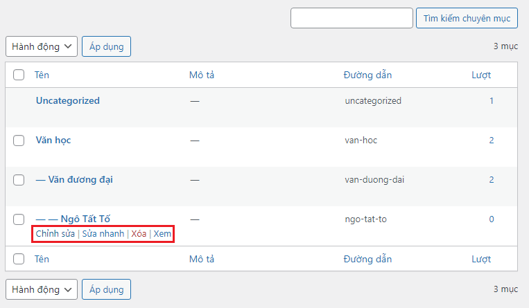 Giống như các màn hình danh sách quản trị viên khác, menu tùy chọn xuất hiện bên dưới tên của Chuyên mục bằng cách di chuột qua hàng của Chuyên mục đó. Bốn tùy chọn là Chỉnh sửa, Sửa nhanh, Xóa và Xem. Tính năng ‘Sửa nhanh’ cho phép bạn thay đổi Tên và Đường dẫn trong danh sách.