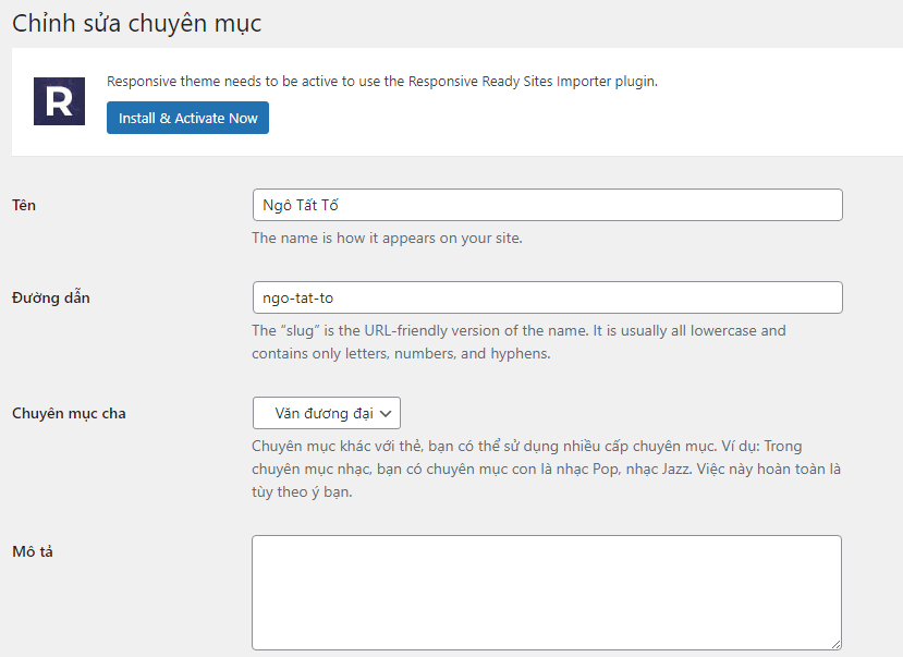 - Mô tả : Thêm mô tả ngắn về chuyên mục của bạn, có thể thêm hoặc không.