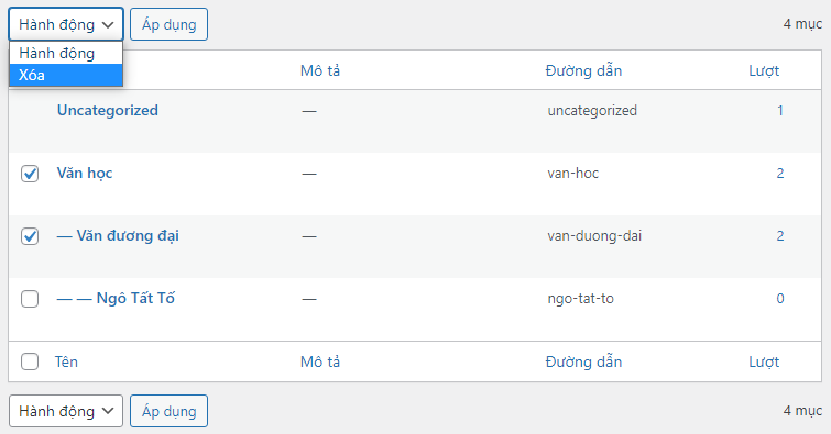 Để xóa hàng loạt các chuyên mục thì bạn tích chọn ô trước Chuyên mục cần chọn. Sau đó kích chọn Hành động ➪Xóa.