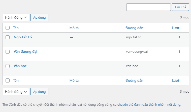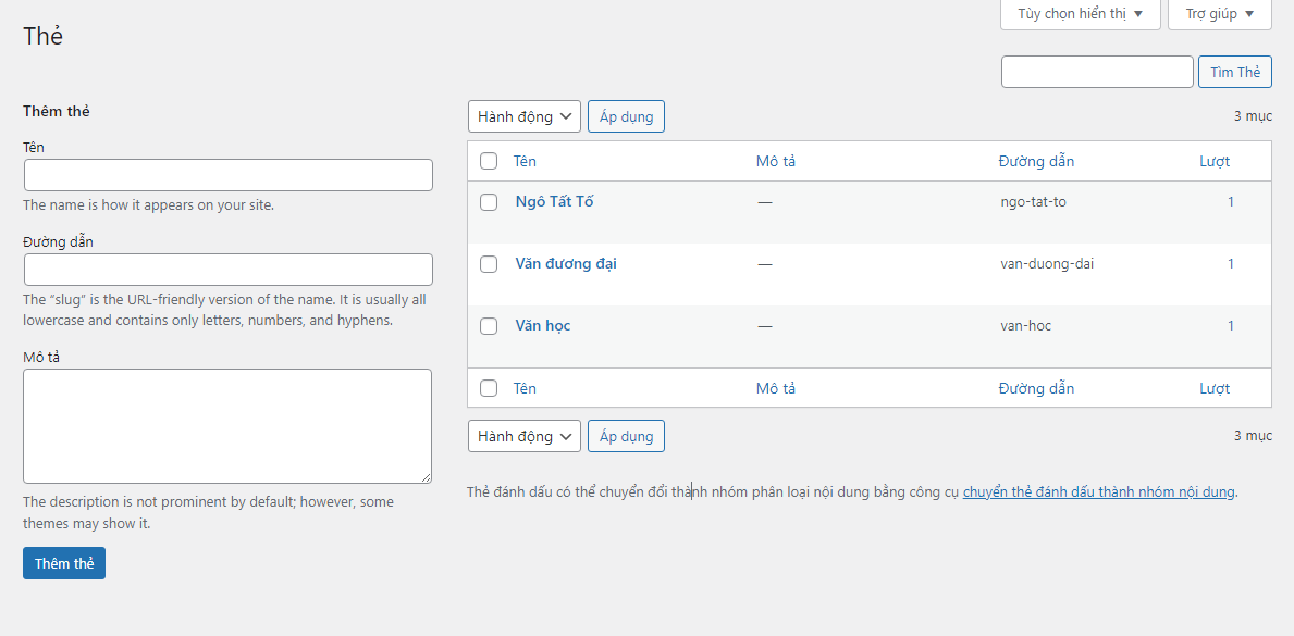 Thẻ là thành phần quan trọng không kém chuyên mục, một thẻ có thể nằm ở nhiều bài viết và một bài viết cũng có thể có nhiều thẻ. Cũng giống như việc tạo và quản lý chuyên mục cho WordPress, việc tạo và quản lý Thẻ cũng tương tự như vậy.