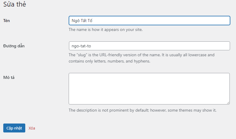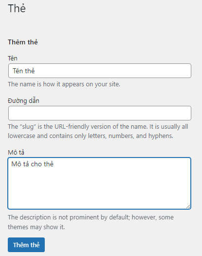 Đường dẫn : Bạn không cần nhập gì ở đây, nên để theo mặc định. WordPress tự động tạo Đường dẫn bằng Tên bạn đặt cho Thẻ.