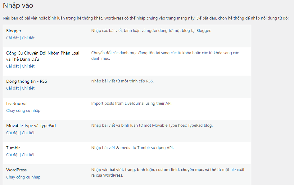 Trên thanh menu bên trái của trang quản trị, bạn di chuột đến menu ‘Công cụ’ ➪ ‘Nhập vào’.