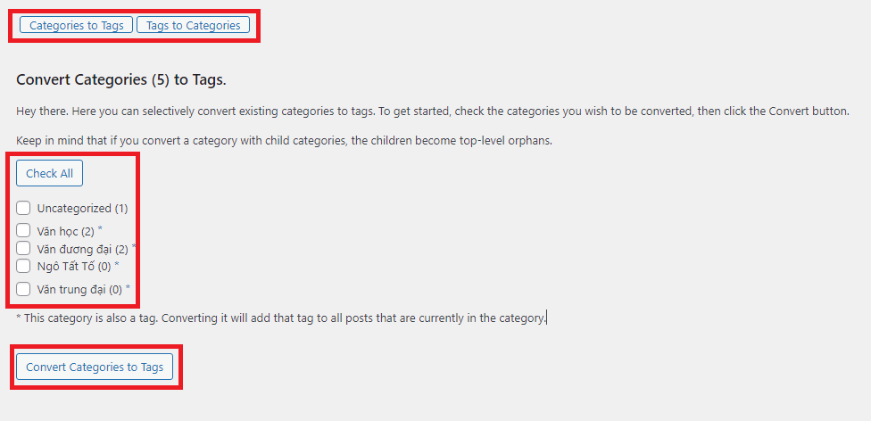 Lựa chọn hình thức chuyển đổi: Tags to Categories hoặc Categories to Tags. Lựa chọn các Thẻ (hoặc Chuyên mục) muốn chuyển đổi. Cuối cùng, click vào nút “Convert Categories to Tags” (hoặc “Convert Tags to Categories“).